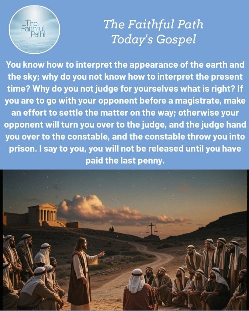 As Catholics, this Gospel calls us to examine our lives. Are we attuned to God’s signs in our daily world? Do we seek reconciliation in our relationships, forgiving as we have been forgiven? In a divided world, Jesus’ words inspire us to be peacemakers, fostering harmony before it’s too late. Let this passage warm your soul, encouraging you to live with wisdom and grace.